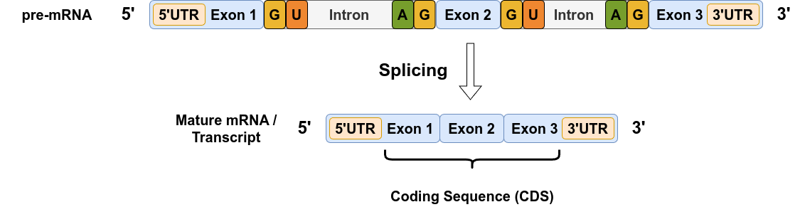 Splicing removes the introns from the pre-mRNA and connects the exons to form mature mRNA. Additional modifications include the addition of a 5’ cap (m7G) and a 3’ poly-A tail, which are necessary for stability and export from the nucleus. In the cytoplasm, the mature mRNA is translated into a polypeptide chain. Ribosomes read codons—three-nucleotide sequences—in the coding sequence (CDS), matching them to amino acids to build a protein. Translation begins at a start codon (AUG) and ends at a stop codon, producing a functional polypeptide that will fold into a working protein.