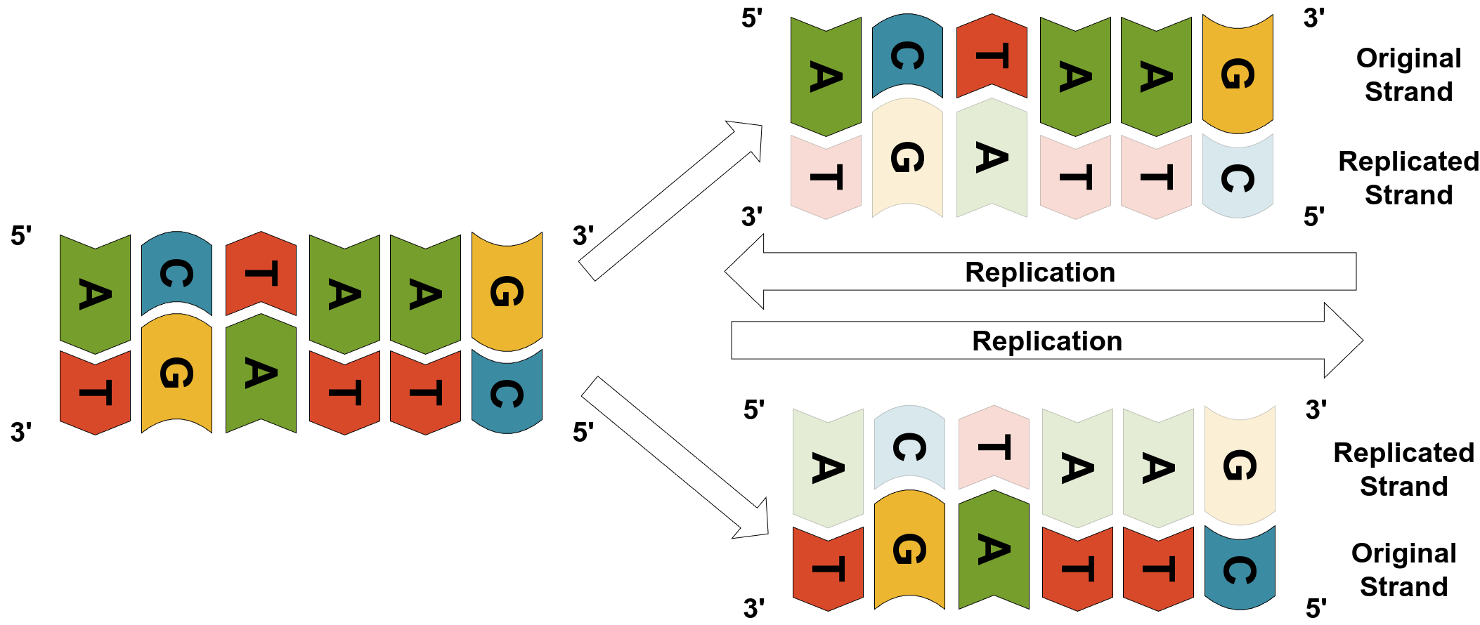 First, we create the genetic material of its mother: starting from a coding strand of DNA, we apply DNA polymerase to generate the complementary template strand. There we have it—our first piece of double-stranded DNA.